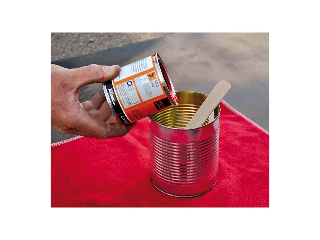 - Namíchejte potřebné množství barvy a tužidla v předepsaném poměru 2,5:1 (barva : tužidlo)