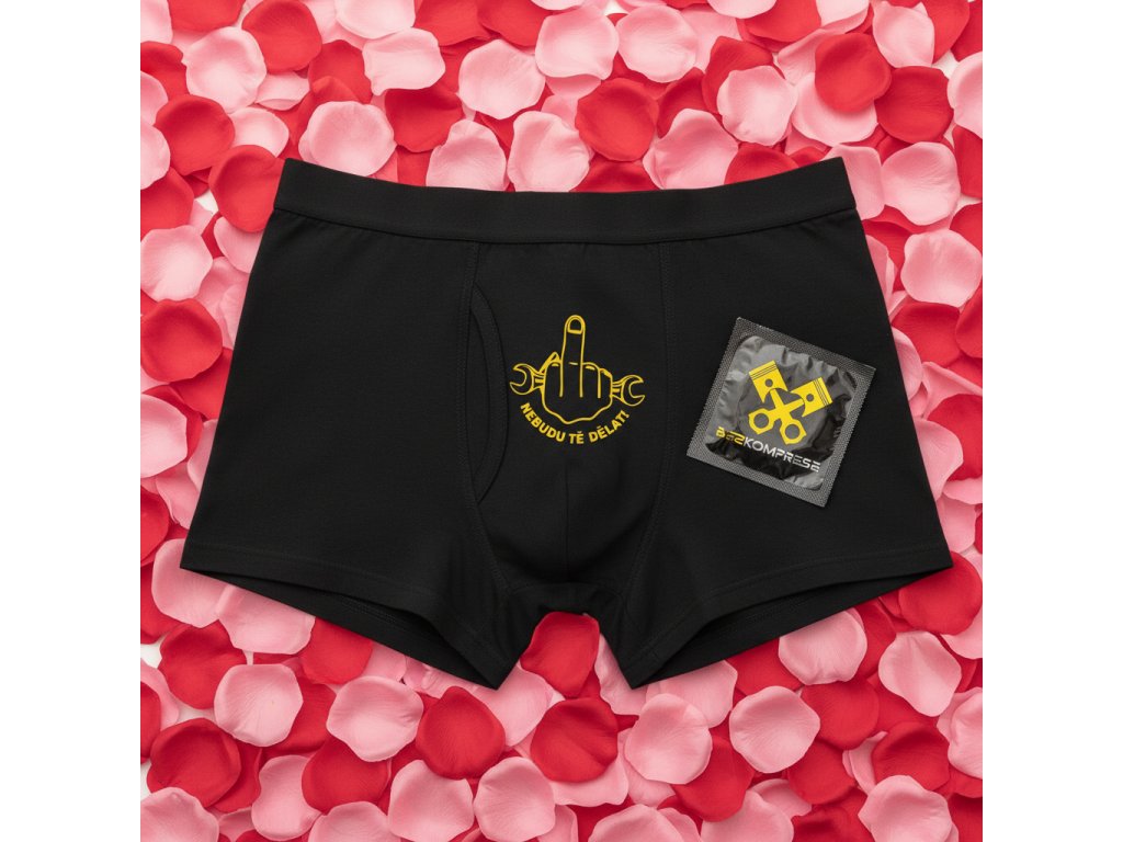 Vybav ho na Valentýna vtipně! 💘 Set obsahuje originální trenýrky „Nebudu tě dělat“ a kondom Bez Komprese. Maximální pohodlí a styl pro váš společný večer. 🎁